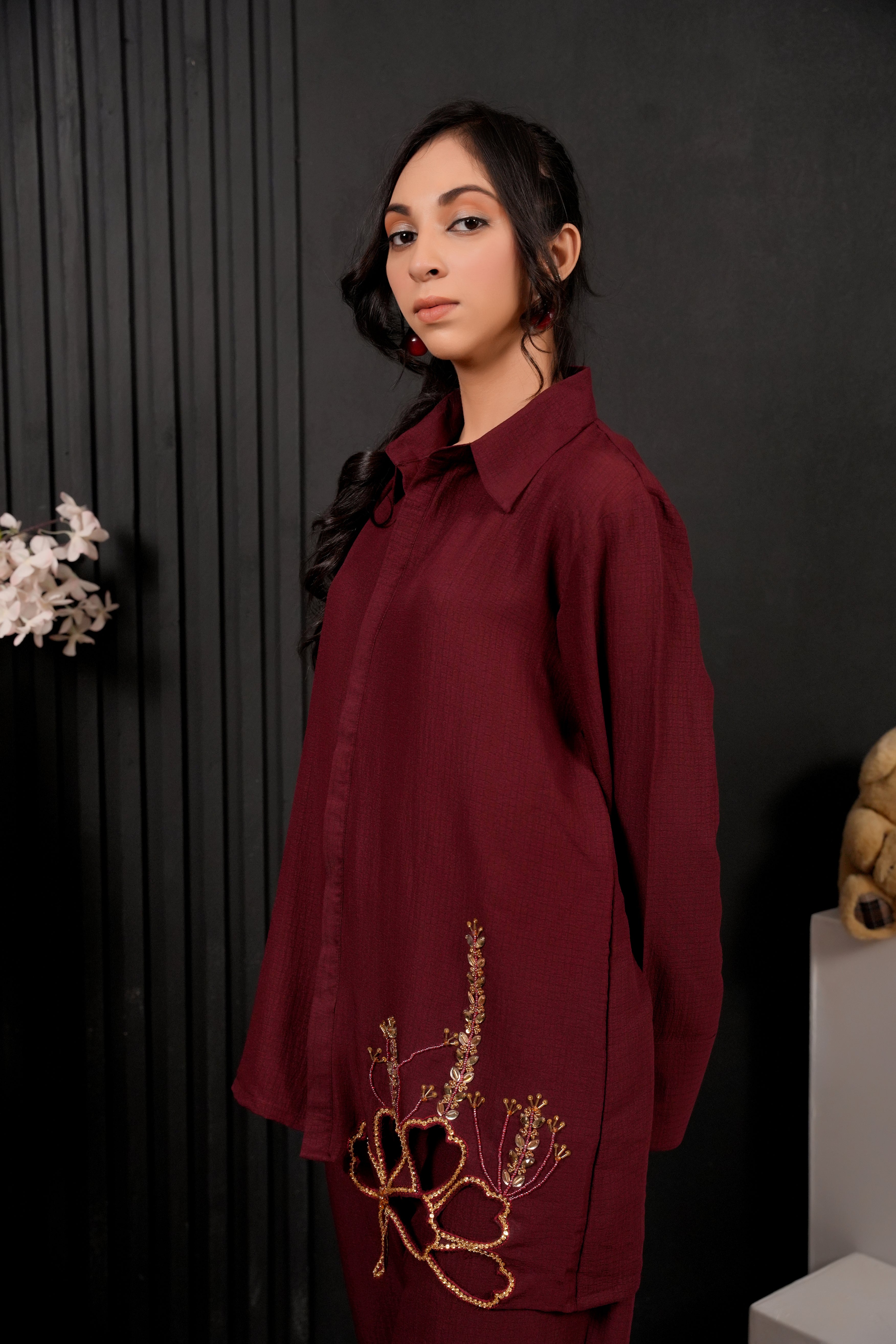 Aurelia – Deep Maroon Co-Ord Set with Gold & Bead Embellishments